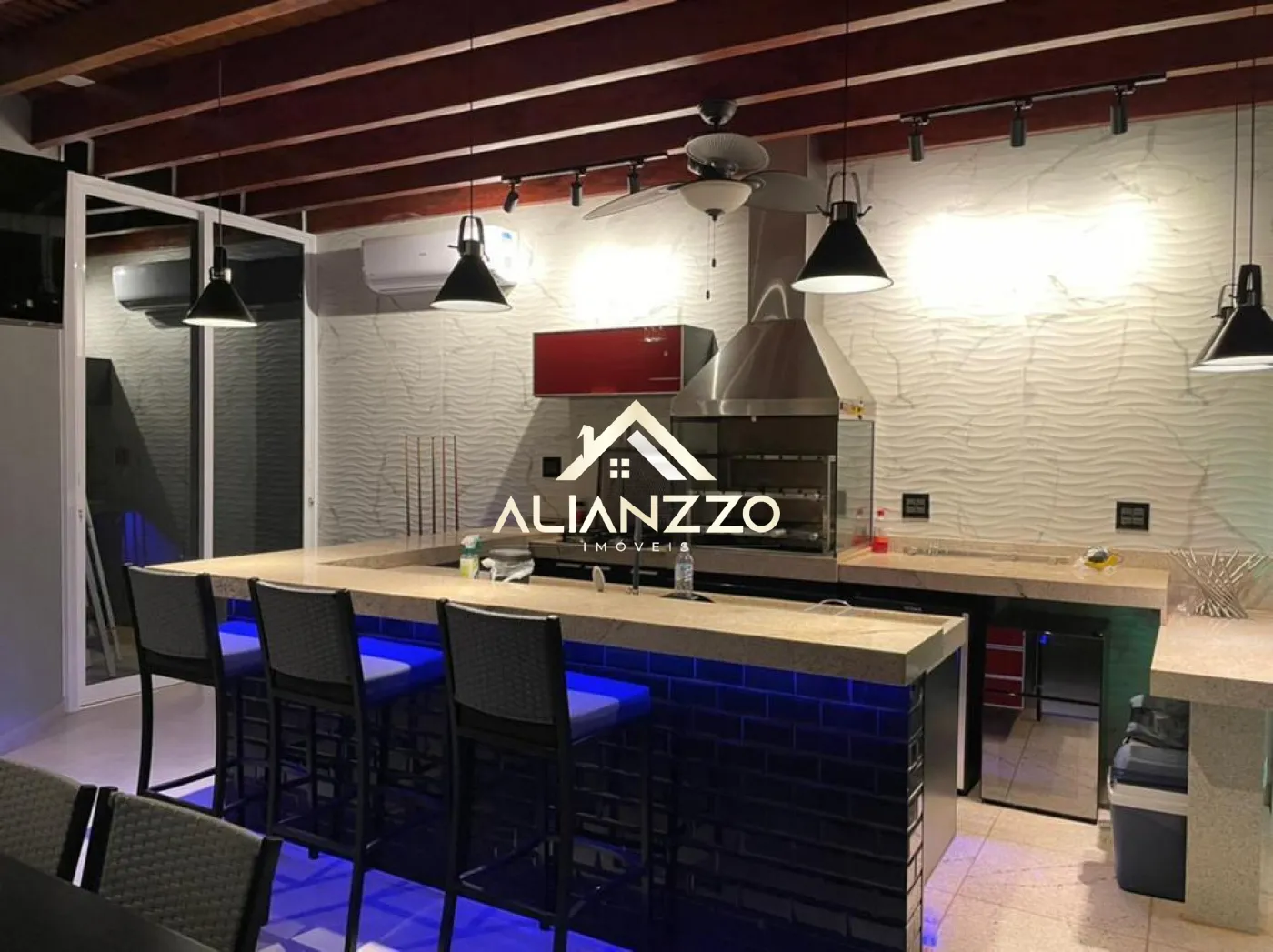 Área de lazer completa com ar-condicionado, churrasqueira e fogão cooktop